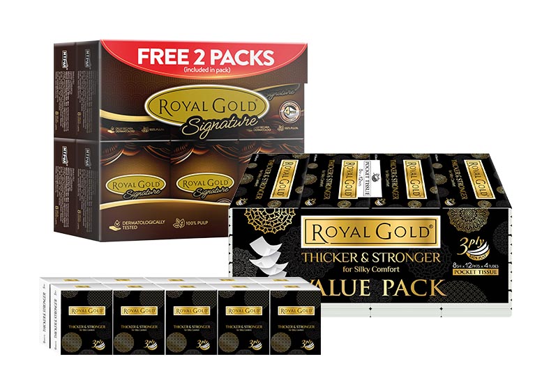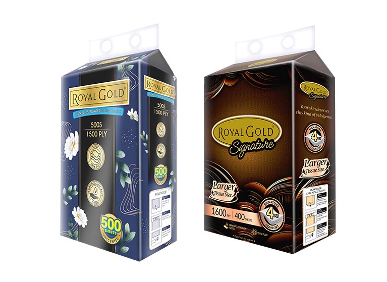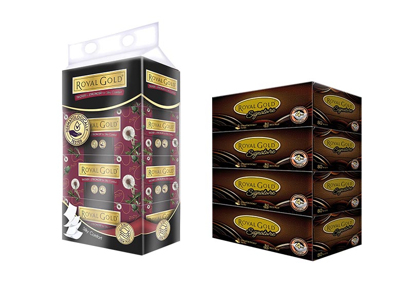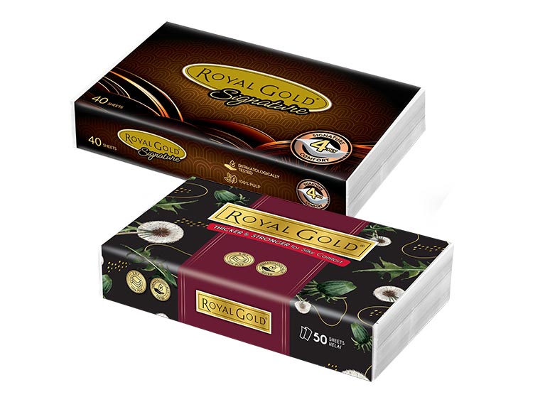 Building on this innovation, ROYAL GOLD Signature (RGS) elevates the experience further with a 4-ply construction, offering enhanced thickness, strength, and softness. The colour-tinted interleaf is layered between premium pure white tissues, resulting in a gentle, pampering touch that feels reassuringly durable.